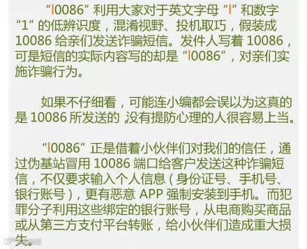 “10086”和“l0086”有什么区别?第二个是小写的L而不是1,你看出来了么?“l0086”作为一种最新型的诈骗手段已经出现了——它伪装成10086发送诈骗信息已导致众多小伙伴上当受骗。