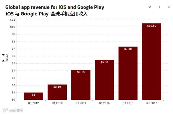 在2017年第一季度,在苹果商店和谷歌商店联合发布者的收入情况报告中,下载和应用内购买的收入已经达到105亿美元,这还不包括应用内购买的广告或贸易收入(如Uber行程)。