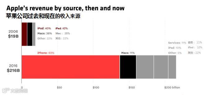 在2006财年,苹果公司实现193亿美元营收和19亿美元利润,这些收益大多数来自iPod和Mac的销售。之后的十年,其业务增长了十倍。在去年,iPhone销售占据了苹果公司63%的营收和大于63%的利润。