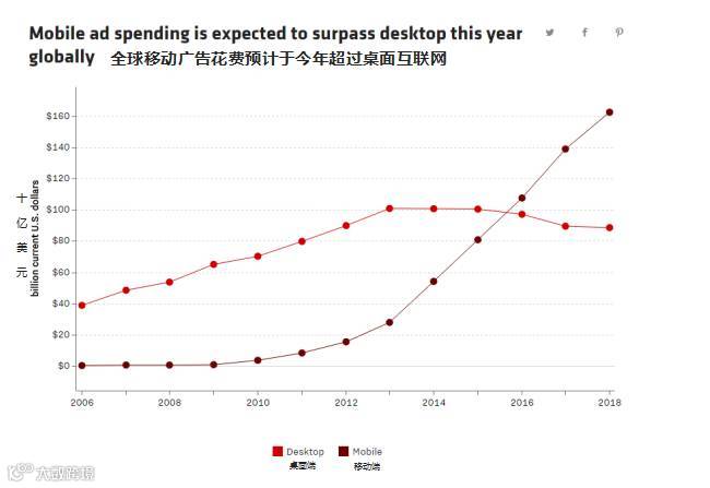 广告现金流总是流向关注度最高的地方。互联网不仅代替了传统广告平台,如广告花费最多的电视,互联网广告本身也在转型。移动广告的花费预计今年将超过桌面互联网。