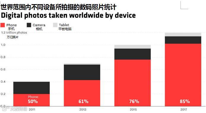 根据市场调查公司KeyPoint Intelligence的报告,就在今年,全球一共拍摄了1.2万亿张的数码照片,其中85%都是手机拍摄的。这相比2011年的4千亿增幅惊人。