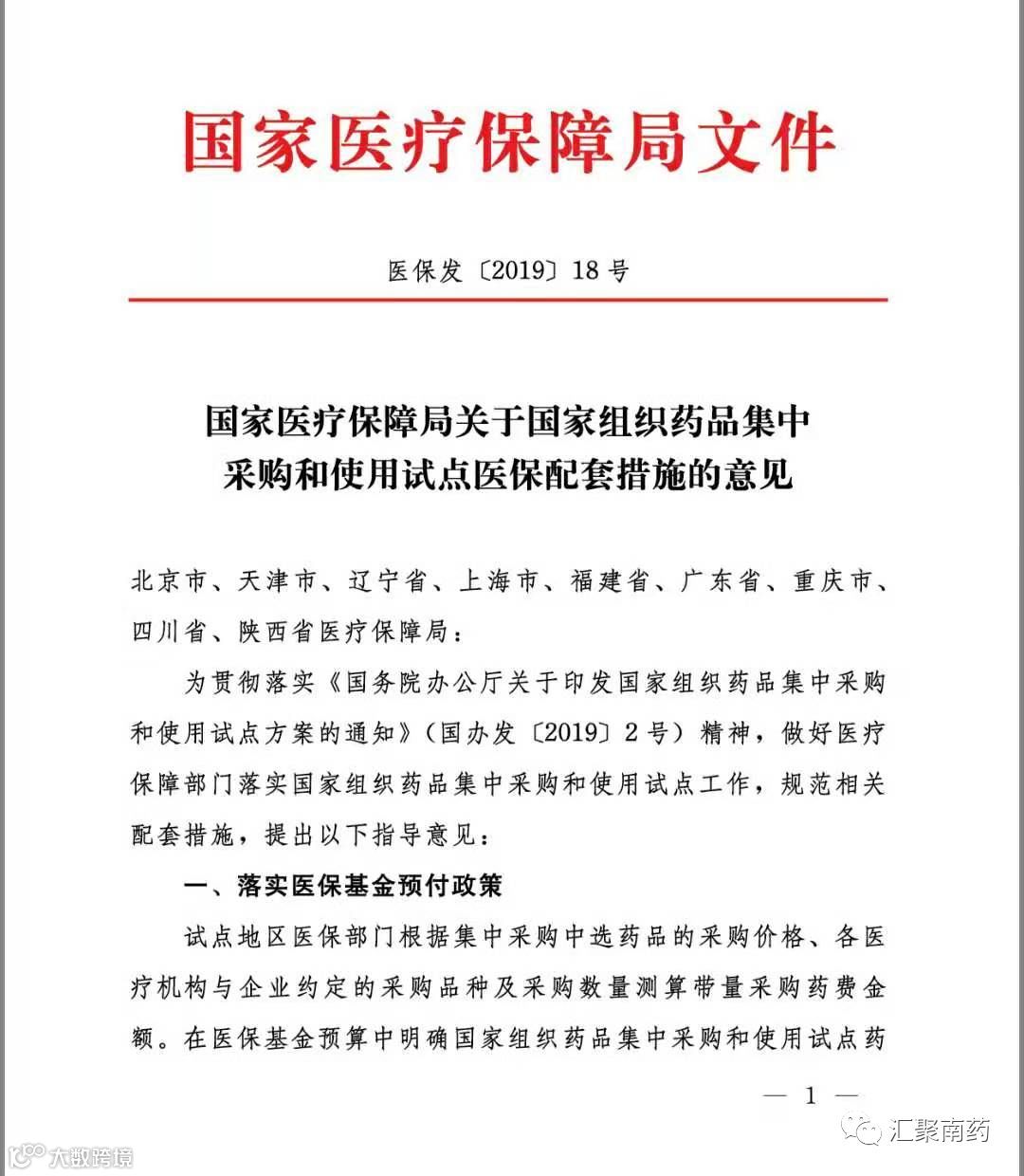 今天,“汇聚南药”公众号传出《国家医疗保障局关于国家组织药品集中采购和使用试点医保配套措施的意见》。