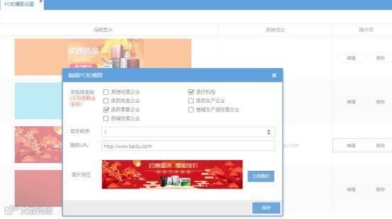 新版本的首页轮播图以及楼层轮播图是按 “采购商类型”进行显示,后台可设置勾选,被勾选到的采购商类型,则表示这张图片只对该类型的采购商显示。