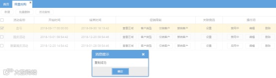 每次设置一个限量抢购 功能,必须分别设定采购商范围、关联的商品、活动时间等,当需要给设置一个新活动,且只是对老的活动进行一个简单的修改时,可以使用这个“活动复制”功能。