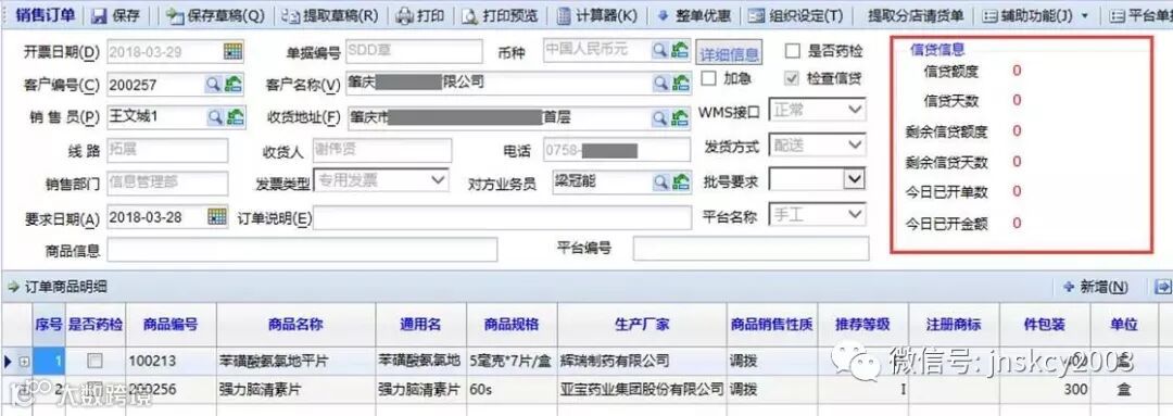 我们在【销售订单】界面增加了【信贷信息】模块,只要在填开单时选择任意客户,界面就会直接显示该客户信贷信息,包括信贷额度、信贷天数、当天已开单数等。