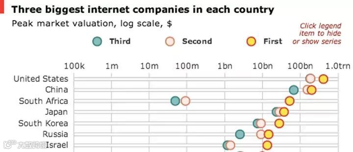 也就是说,要获得十亿美元估值并不容易。通过研究全球的科技公司,这张图表不仅显示了每个国家的制造巨大财富的能力,也显示了其市场规模。