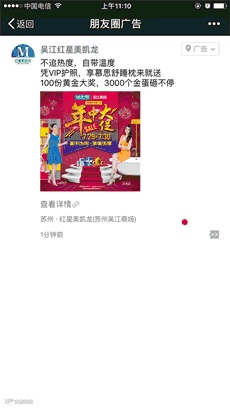 红星美凯龙作为传统家居卖场,如何利用天然商场人流成为关键。吴江红星美凯龙投放朋友圈广告,依托微信优质流量向潜客传递“梦享家”计划及自身的“家居美学”,广告标签则对准中产人群。