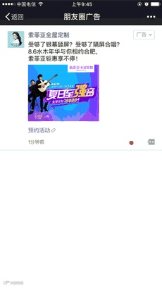 索菲亚合肥店投放朋友圈广告,利用明星效应凸显品牌价值观,用户只需线上预约即可参与明星演唱会,很快引起粉丝关注。同时利用微信大数据,选定了关注“金融、汽车、旅游”等小资人群的标签,针对性投放,保证了转化率。