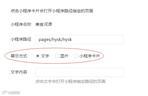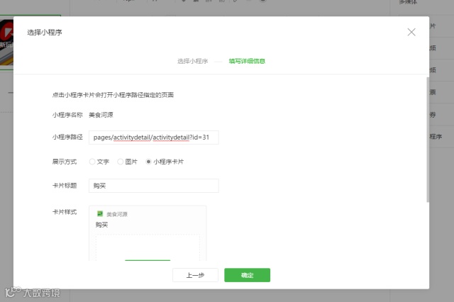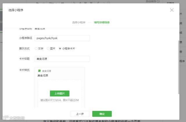 如下图,选择小程序卡片,上传图片,点击确定即可。但是这样只能跳转到小程序的首页,如果你想跳转到其他页面,就需要修改小程序路径。
