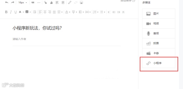 关联了小程序后,编辑文章的时候,在需要嵌入小程序某个页面的时候,点击小程序。