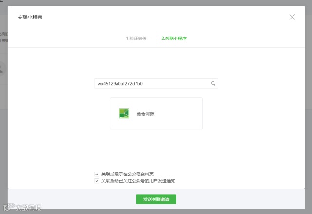 请公众号管理员扫码确认开通此项功能,待管理员确认之后,在搜索框中填写美食河源小程序的APPID:wx45129a0af272d7b0, 并点击搜索,发送关联邀请。