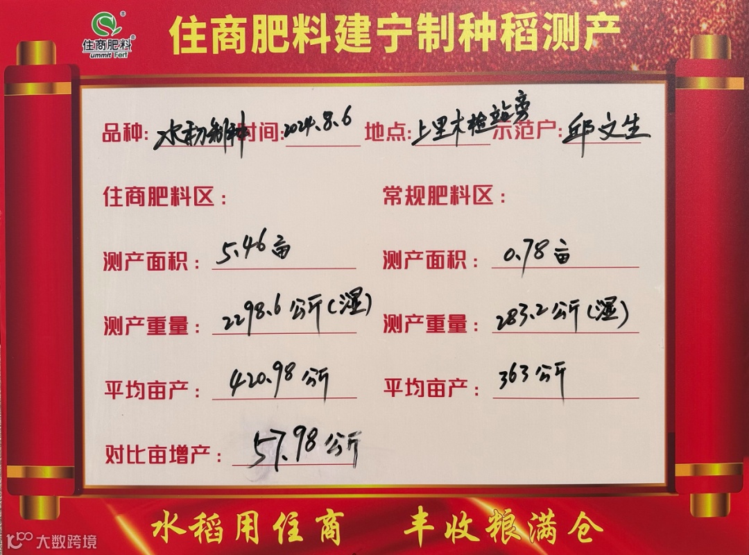 经住商肥料建宁制种稻测产、邱老板使用住商肥料田块面积5.46亩,测产重量2298.6公斤(湿谷)平均亩产420.98公斤。邱老板使用常规肥料田块面积0.78亩,测产重量283.2公斤(湿谷)平均亩产363公斤。最后,在众多农户的见证下,我们计算得出了准确数据:对比亩增产57.98公斤。