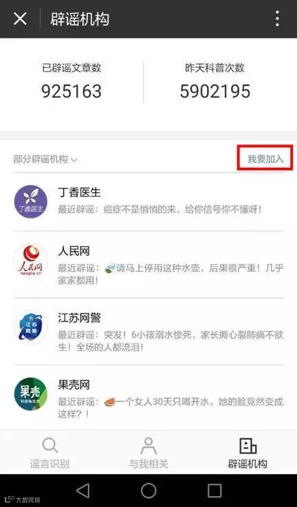 在“辟谣机构”页面可以看到