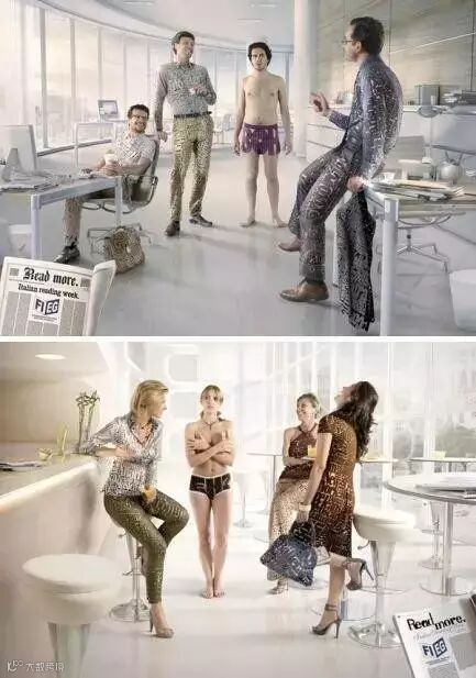 这是一则报纸广告,图中的人聚在一起聊天,但是旁边都站着一个融不进他们的人。仔细看图中人物的衣服都是文字拼接而成,知识就像衣服,多读多看,不断丰富知识面,才不会傻傻的站在一旁只能看别人聊天。