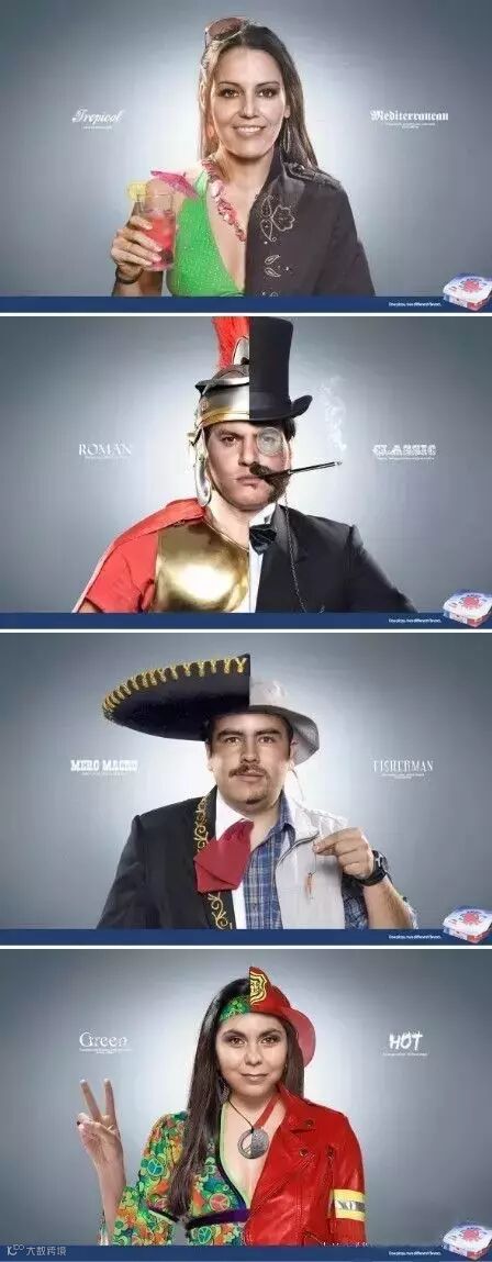 某饼干广告:看到图片的时候,小编想了很久,这到底是什么鬼。看了设计师思路才明白。“一种口味,一种状态”。不同口味的饼干,给你不同的感觉。