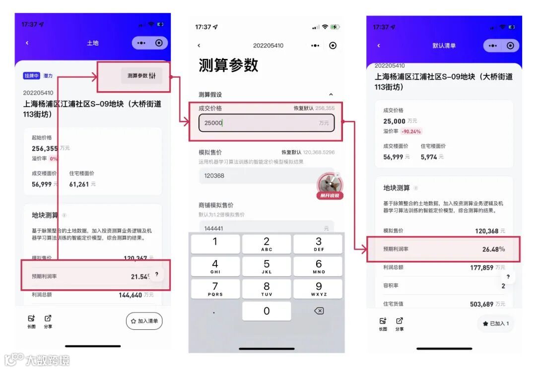 我们深知,算法不能完全代替人的判断,因此在土地数据查询和参考的基础上,用户使用投资清单还可以输入自己的测算数据逻辑,并加入收藏,快速计算不同业务逻辑下的土地模拟利润率,以达到快速初筛的目的。