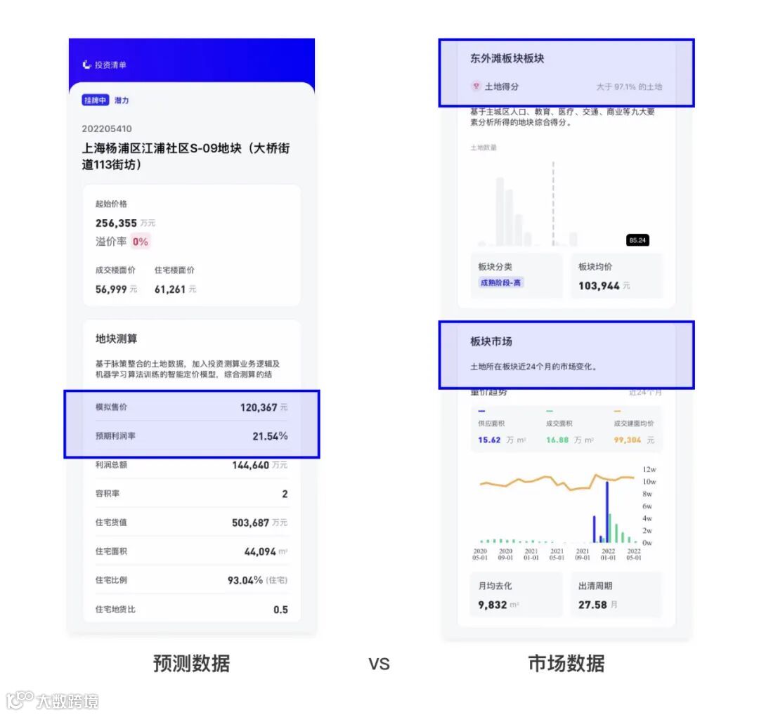 以杨浦区江浦社区S-09地块(大桥街道113街坊)地块为例,通过投资清单小程序的查询,土地研究者既可以获取传统的土地市场信息,如板块情况、规划指标等;也可以快速获知数据科学算法对土地的预测判断,也就是模拟售价和利润率等,方便人机对比。