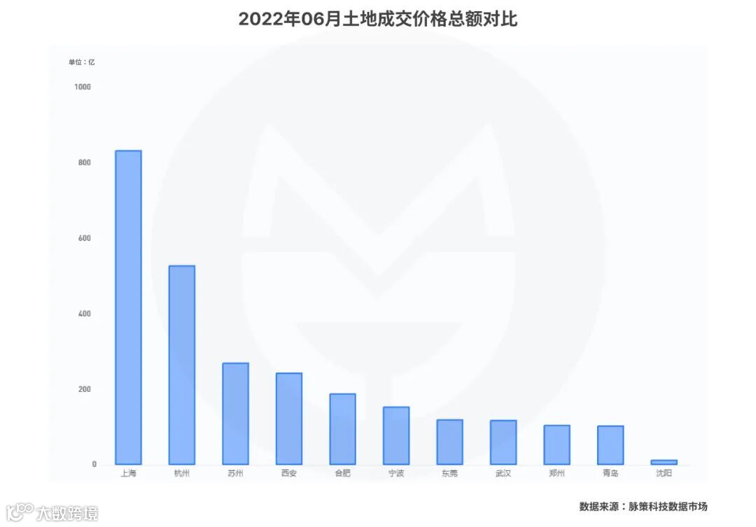 根据脉策科技数据市场整合纠偏的土地数据,上海六月的成交量在24个重点城市中冲榜第一,远超第二名杭州。