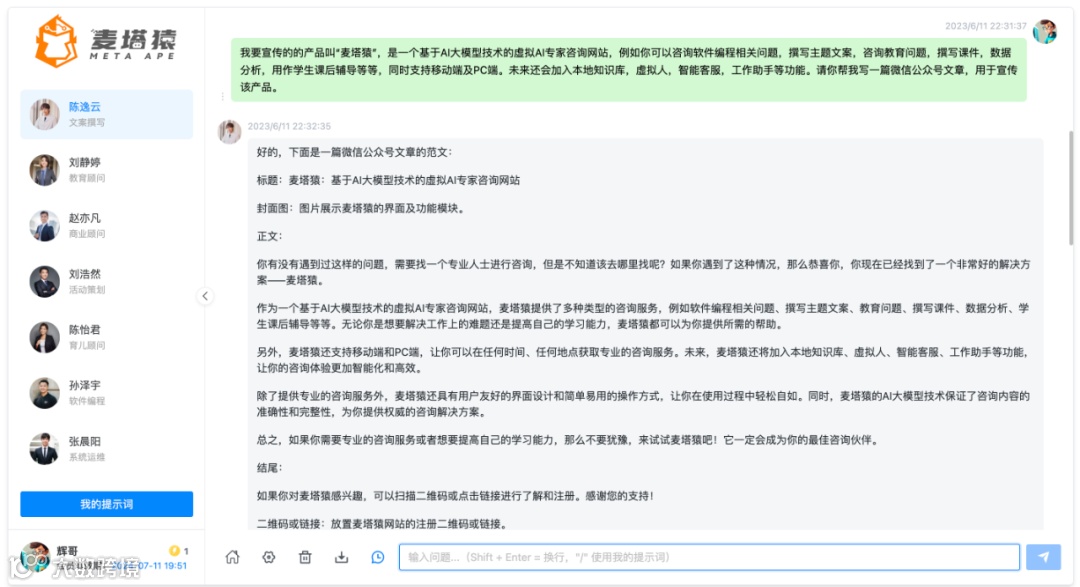 导读:一个基于AI大模型技术的虚拟AI专家咨询网站——麦塔猿。提供多种类型的咨询服务、支持移动端和PC端、未来加入本地知识库、虚拟人、智能客服、工作助手等功能。如果您需要专业的咨询服务或者想要提高自己的学习