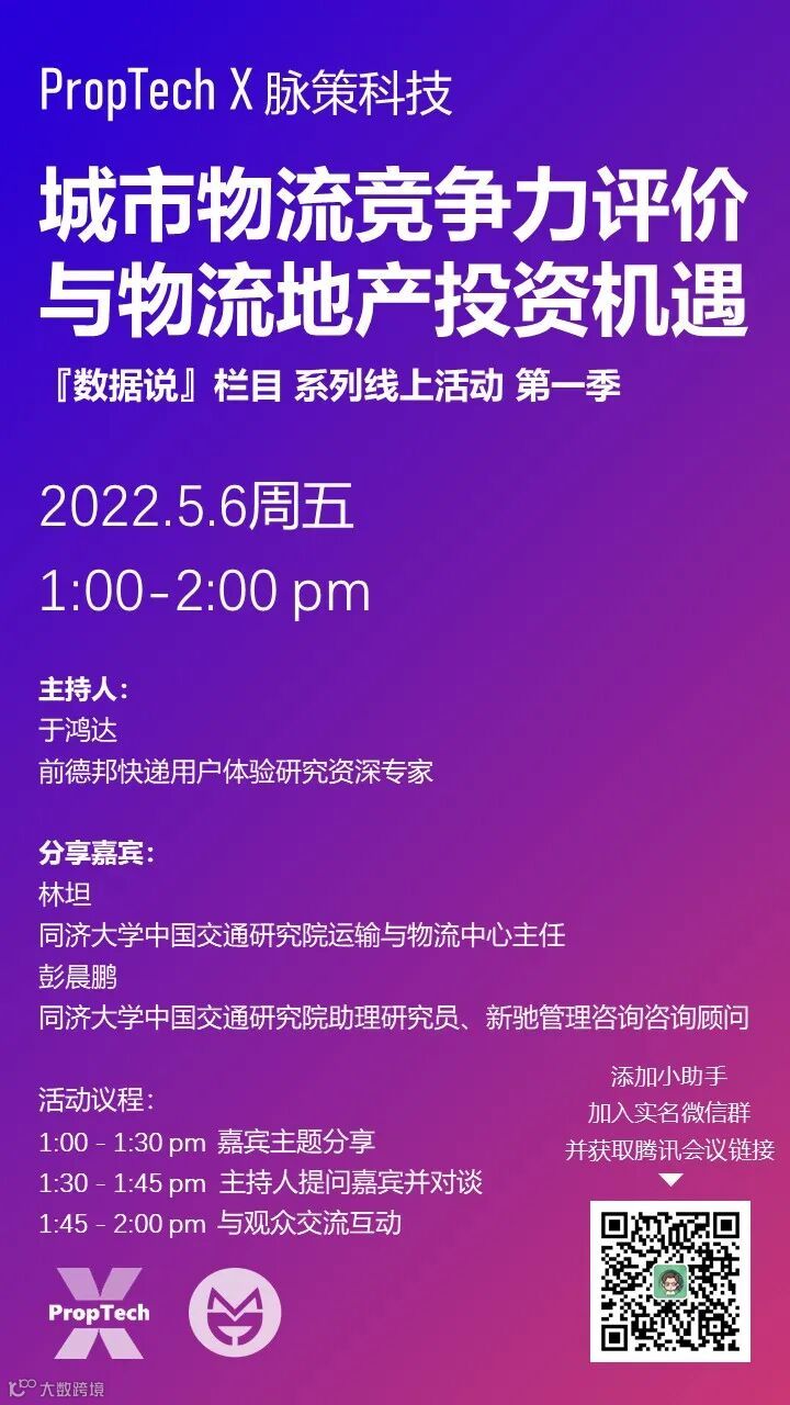 PropTech X 和 脉策科技 荣幸地邀请到同济大学中国交通研究院运输与物流中心主任林坦,同济大学中国交通研究院助理研究员、新驰咨询公司咨询顾问彭晨鹏,以及前德邦快递用户体验研究资深专家于鸿达,将于5月6日周五午间,和各位朋友们开启一场线上聊天会。