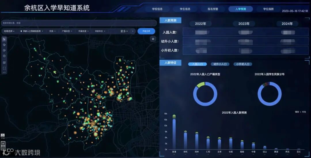 // 入学预测:可看到区层面未来落到空间的入园人口、幼升小人口、小升初人口预测。