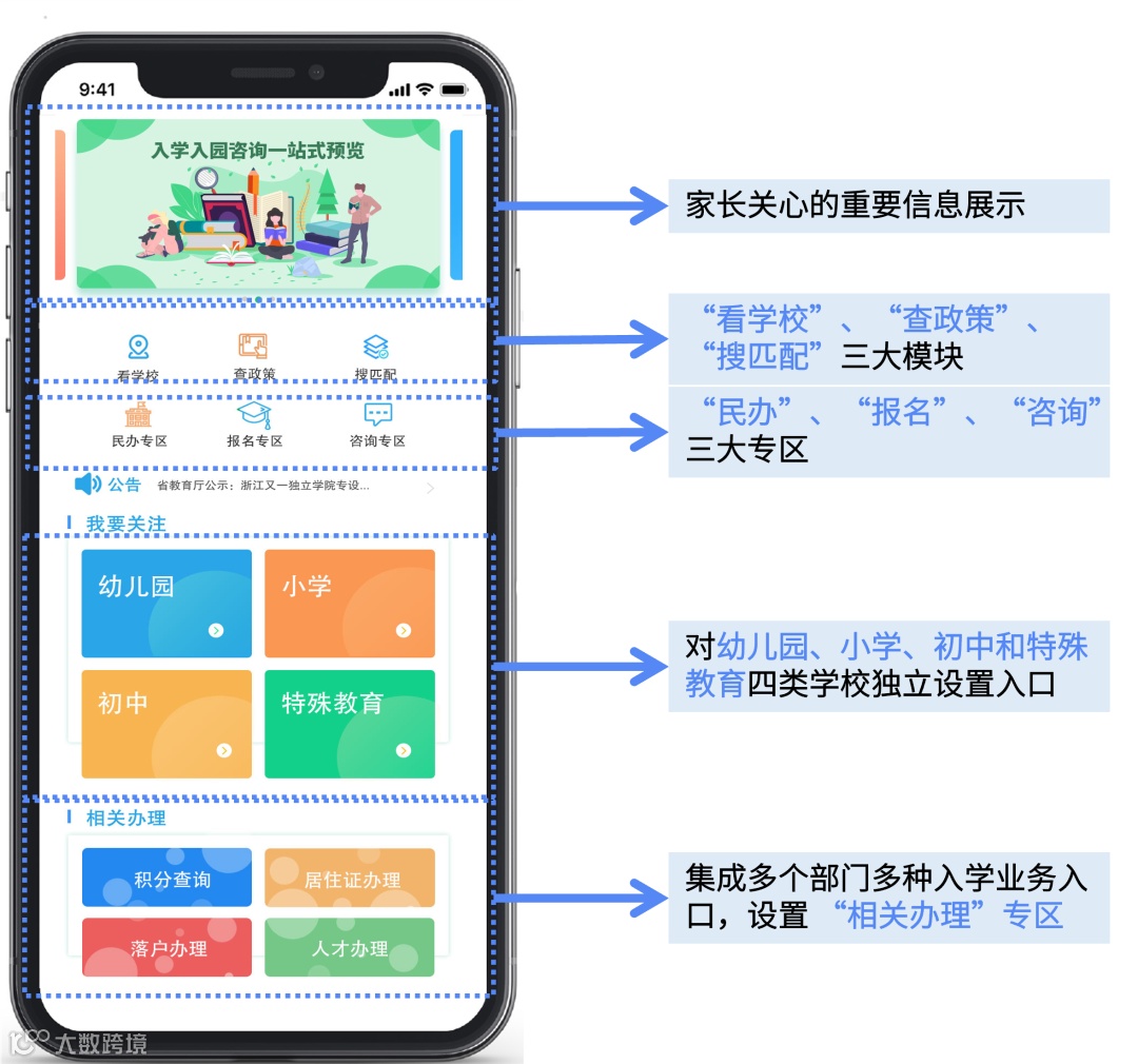 市民服务端集成了“看学校”、“查政策”、“搜匹配”三大功能,并打通了入园入学报名及其他相关业务办理入口。当家长完成学校或政策信息查询、确定入学意向后,可通过入口一键进入相关业务办理系统,从而实现“信息—决策—行动”的一站式通道。