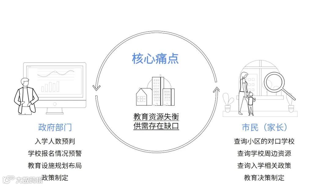 政府部门的痛点在于学龄人口数量及分布等数据难获取、学区划片信息更新不及时、未来的招生规模难预测等,无法支撑更精准的政策方案。市民的痛点在于难以查到周边学校的招生信息、最新的教育政策、未来学校规划建设和招生计划等信息,无法制定更合理的子女入学计划。