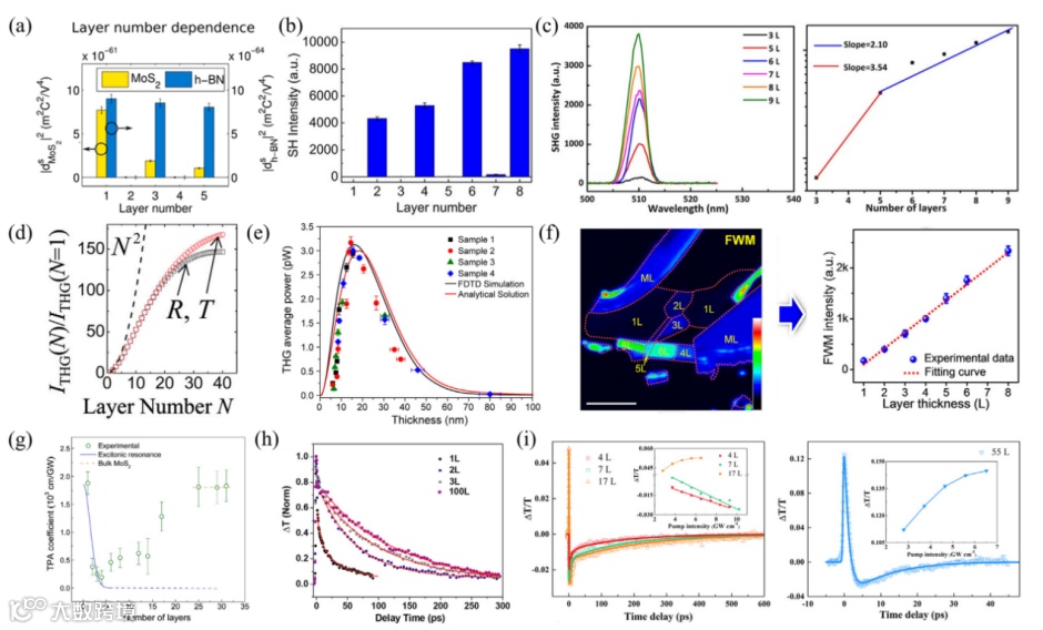 实验测得一些非线性光谱的层数依赖性,数据来源:Laser Photonics Rev. 2023, 17, 2200357