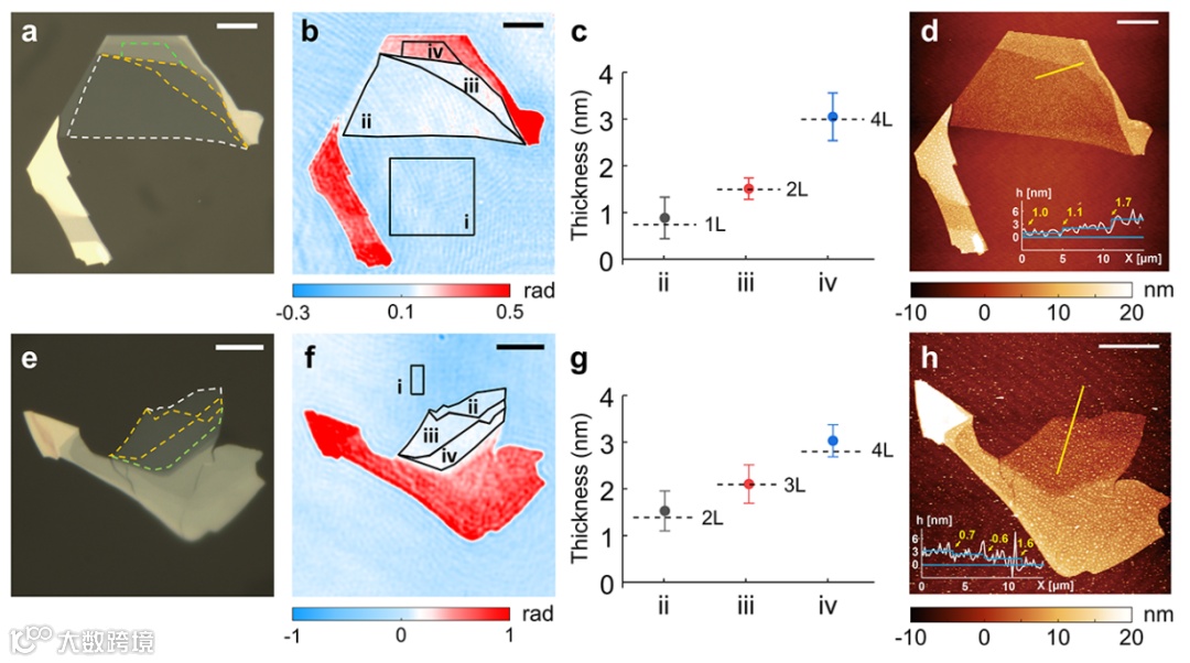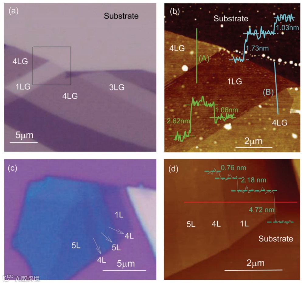 显微镜(左)和AFM(右)的层数判定对比,数据来源:Adv. Funct. Mater. 2017, 1604468