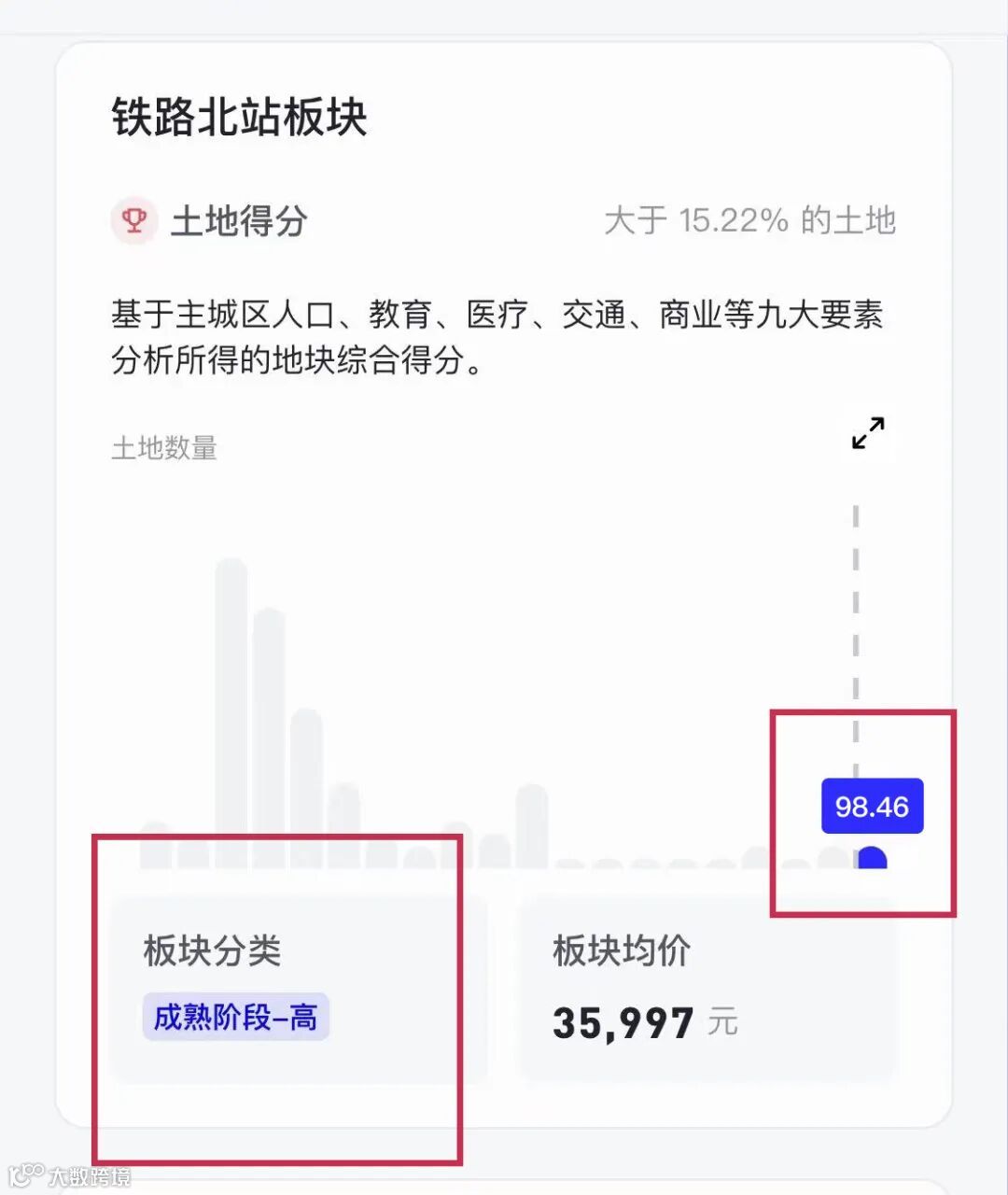 在投资清单的中,用户会看到后台算法对所有的招拍挂土地所在板块进行了评分与评价。这个评价基于人口、商业、商务、教育等9大指标计算得出,作为快速研判土地所在地周边价值的参考标签。