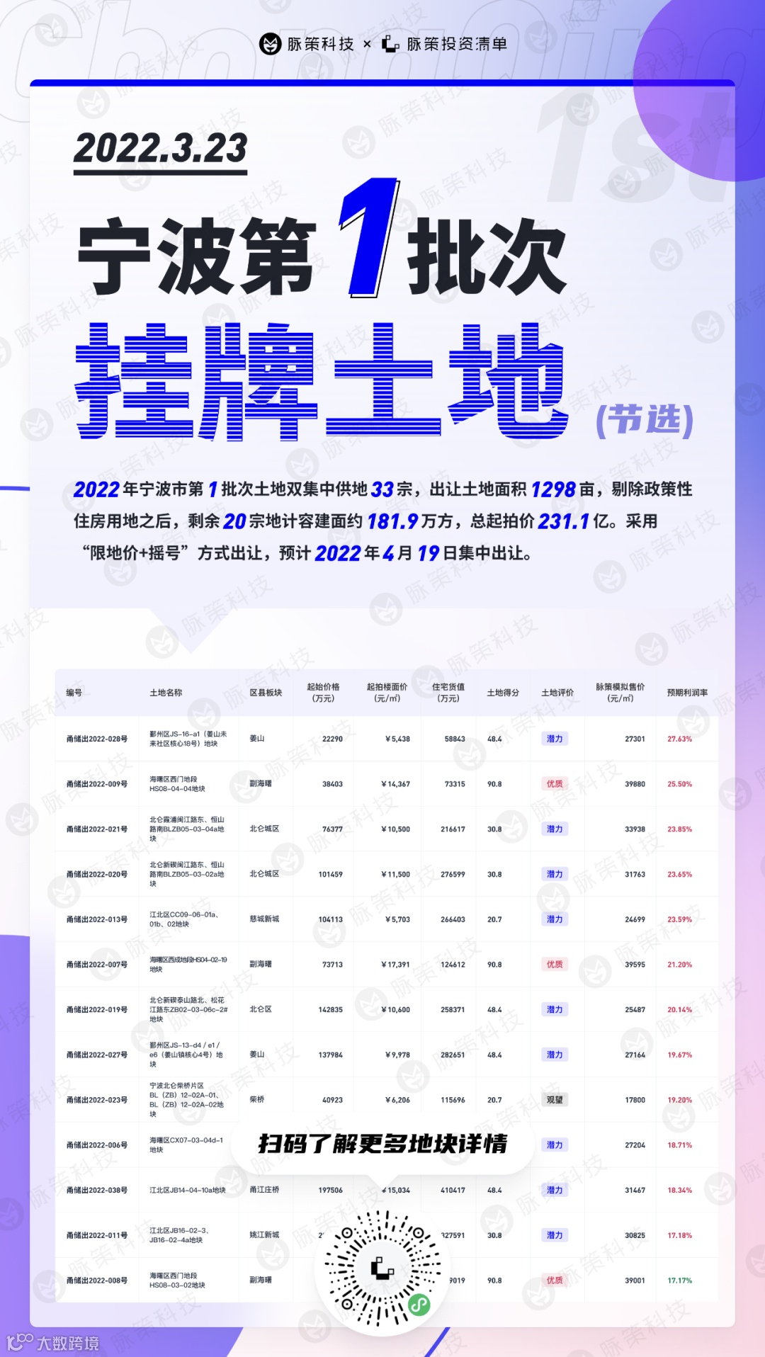 3月23日,杭州和宁波均公布了今年第一批次的土地。其中杭州市60宗,宁波市33宗。