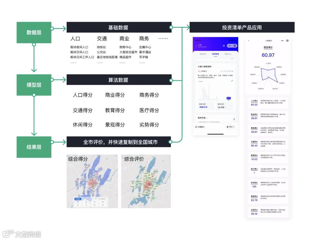 在【数据】层面,脉策采集、清洗、整合海量城市人口、配套、交通等POI数据,形成标准数据产品;在评价【模型】上,脉策以城市为单位,按不同【人口】密度分段,对板块【区位】进行空间划分,对【规划】利好进行分类,对【配套】成熟度、【交通】、【景观】条件进行打分,形成综合全面的研判模型;在【成本】上,运用模型算法快速对全市域板块进行评价,并批量复制至全国范围,极大降低了板块研判成本。