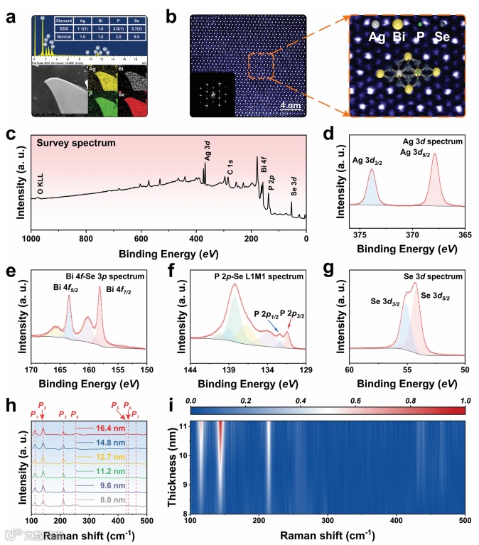 图2 AgBiP2Se6的 EDX、STEM、XPS 和拉曼表征。a) 合成的 AgBiP2Se6纳米片的 SEM 图像、EDX 结果和相应的 EDX 元素图。b) AgBiP2Se6的 STEM 图像。c) AgBiP2Se6的高分辨率XPS测量光谱。d–g) AgBiP2Se6的 Ag 2p、Bi 4f-Se 3p、P 2p-Se、Se 3d 的高分辨率 XPS 光谱。h) AgBiP2Se6的层相关拉曼光谱。i) 层相关拉曼光谱的相应彩色等值线映射,其中颜色反映了拉曼振动的相对强度。