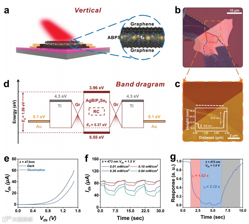 图3 基于石墨烯/AgBiP2Se6 /石墨烯垂直异质结构的NPC光电探测器。a) 基于石墨烯/AgBiP2Se6/石墨烯的垂直NPC光电探测器的示意图。b,c) 石墨烯/AgBiP2Se6 /石墨烯垂直NPC光电探测器的光学图像和AFM图像。d) 基于石墨烯/AgBiP2Se6/石墨烯的垂直NPC光电探测器的能级图和能带排列图。e) 不同激光功率密度下暗光和 473 nm 激光照射下的I ds – V ds曲线。f,g) 在激光 ( λ = 405 nm) 照明下, V ds = 1.5 V时的时间分辨光响应。