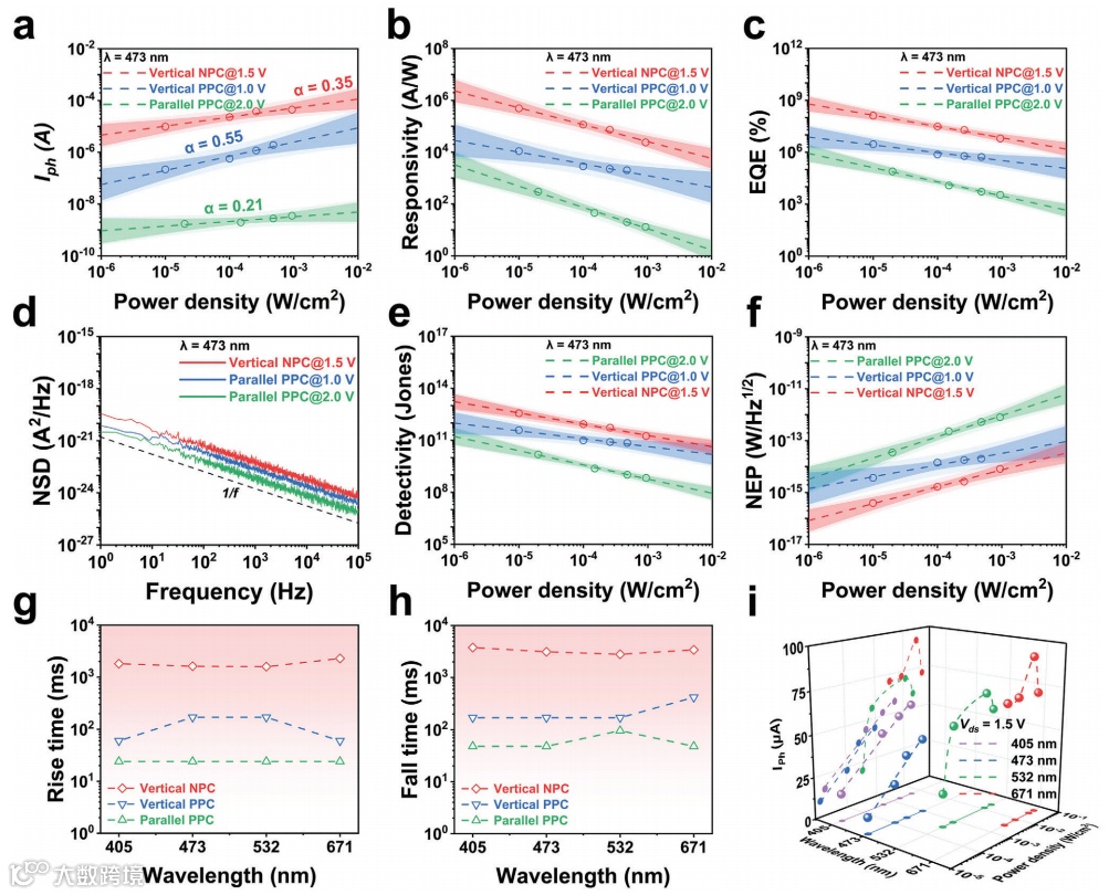 图4 AgBiP2Se6平行PPC光电探测器、石墨烯/AgBiP2Se6/石墨烯垂直PPC和NPC光电探测器的综合光电性能比较。a-f) 在波长 473 nm 激光照射下I Ph、R、EQE、NSD、D和 NEP的比较。g,h) 响应时间的比较。i) 在具有较高光功率密度的405、473、532和635 nm激光照射下,石墨烯/AgBiP2Se6 /石墨烯垂直NPC光电探测器的I Ph与光功率密度的函数关系。