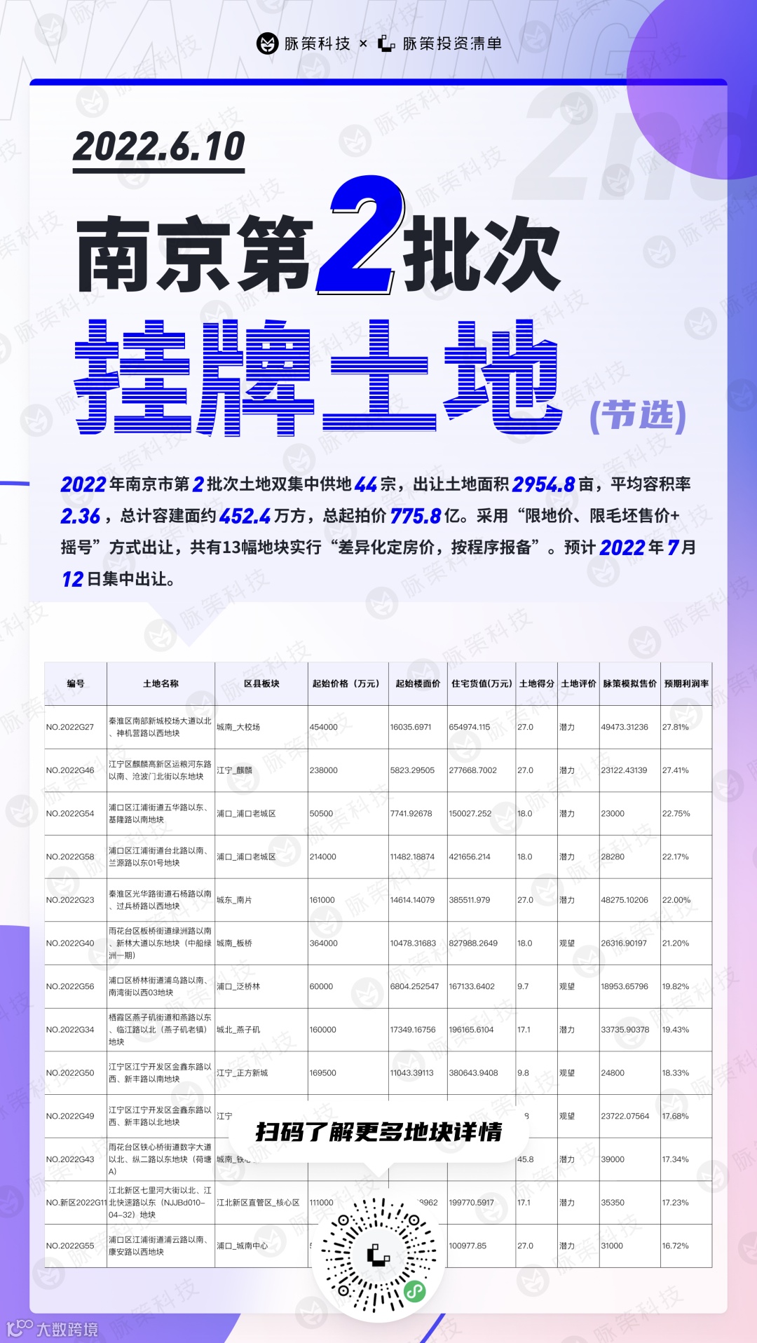 2022年南京市第2批次土地双集中供地数据更新,扫码使用投资清单小程序,即可快速测算拍卖中的土地,完成土地定位。