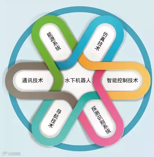 水下机器人是一种技术密集性高、系统性强的工程,涉及到的专业学科多达几十种,主要包括仿真、智能控制、水下目标探测与识别、水下导航(定位)、通信、能源系统等六大关键技术,见图5。无缆水下机器人(AUV)又称自治水下机器人,是将人工智能、探测识别、信息融合、智能控制、系统集成等多方面的技术集中应用于同一水下载体上,自主决策、控制完成复杂海洋环境中的预定任务使命的机器人。