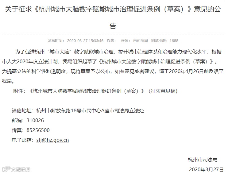 iv. 关于征求《杭州城市大脑数字赋能城市治理促进条例(草案)》意见的公告