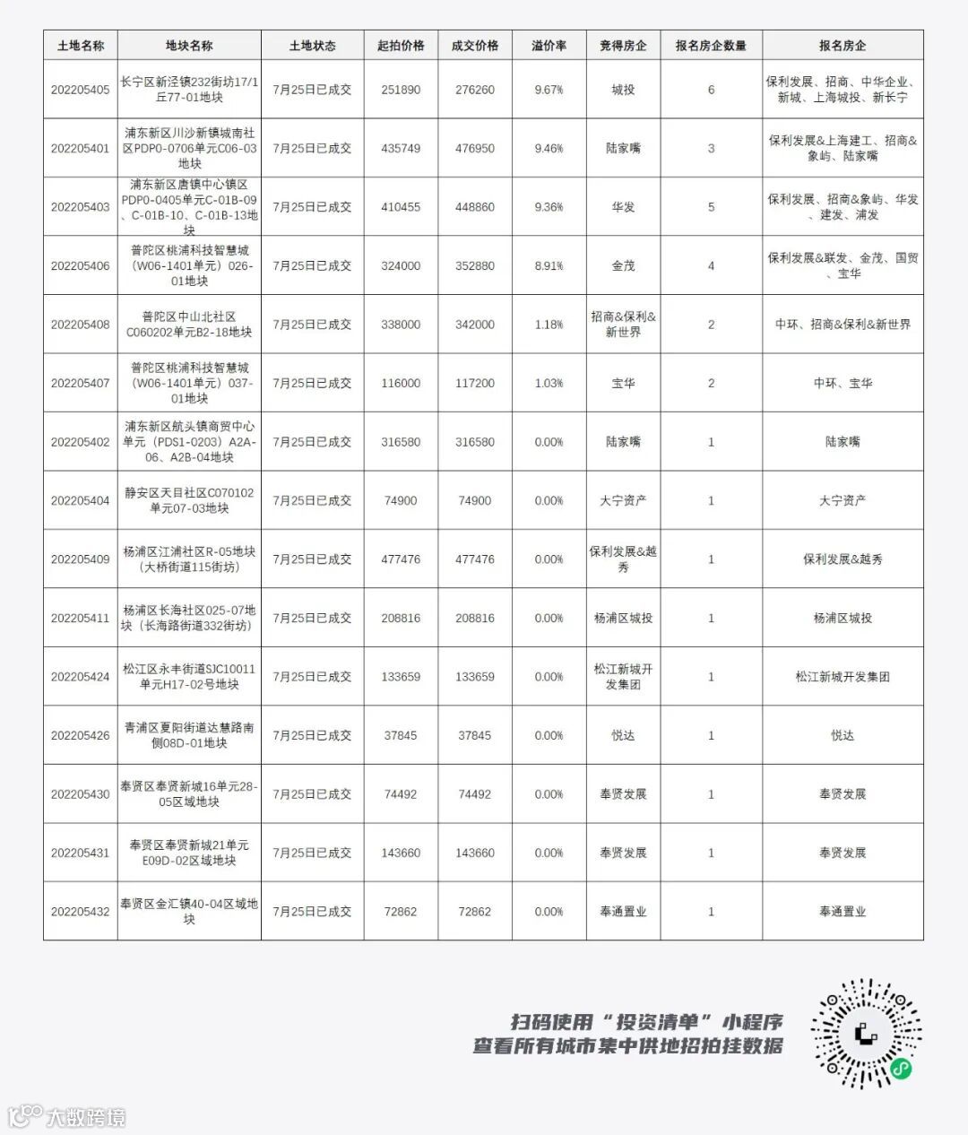 长宁区新泾镇232街坊17/1丘77-01地块共吸引了6家房企参与,本批最热土地,报名房企最多,最后由城投拿下。