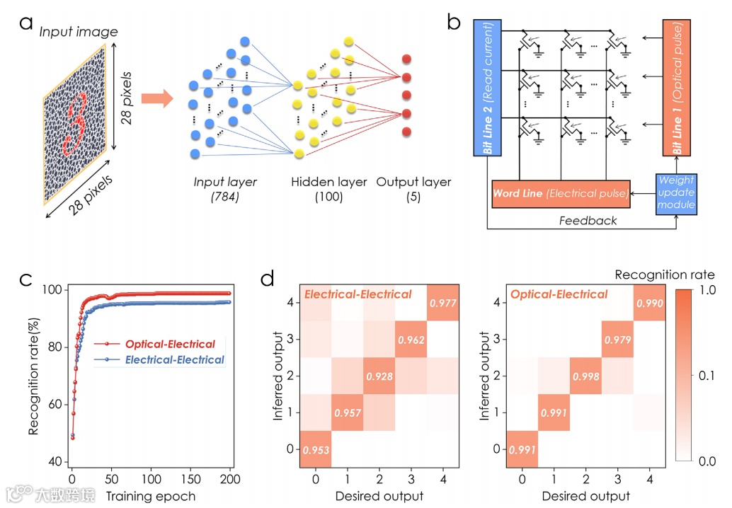 图 6. 光电神经网络(ONN)的硬件仿真 a)三层光电神经网络(ONN)的示意图,该网络包含 784 个输入神经元、100 个隐藏神经元和 5 个输出神经元;b)硬件电路示意图,包括光电突触阵列与外围电路;c)识别率随光 - 电训练周期及电 - 电训练周期变化的关系曲线;d)经过 200 个光 - 电训练周期与电 - 电训练周期后,用于对比预期值与预测值的混淆矩阵。