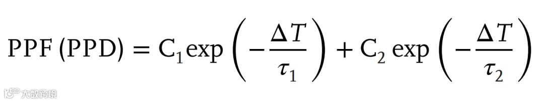 随后,施加两个连续的 Vgs 脉冲(-10 V 和 10 V,宽度均为 1 ms),实现了两种不同形式的STSP—— PPF与PPD。用 A1和 A2分别表示两个脉冲诱发的 PSC 变化,PPF(或 PPD)指数定义为 A2/A1。PPF 与 PPD 行为与两个连续 Vgs 脉冲的ΔT及τ密切相关,呈现典型的双指数衰减特性,可用双指数方程拟合 :