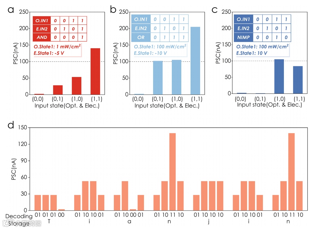 “与” 逻辑运算可实现硬件互联的数据通信,保障编码、传输和解码过程的安全性。在此背景下,光脉冲的 “开 / 关” 状态代表数字信息的第一位,Vgs 脉冲的 “开 / 关” 状态代表第二位。在数据通信概念验证实验中,信号单元 00、01、10 和 11 的输出电流分别为 2 nA(记为 A)、28 nA(记为 B)、53 nA(记为 C)和 140 nA(记为 D)。根据美国信息交换标准代码(ASCII),字符串 “Tianjin” 的每个字符均编码为四个输出电流的组合:BBBA、BCCB、BCAB、BCDC、BCCC、BCCB、BCDC。为避免信号单元之间的干扰,每次编码后需对闪存进行电擦除。最终,可根据硬件器件的光电特性对读取信号进行解码,如图 5d 所示。