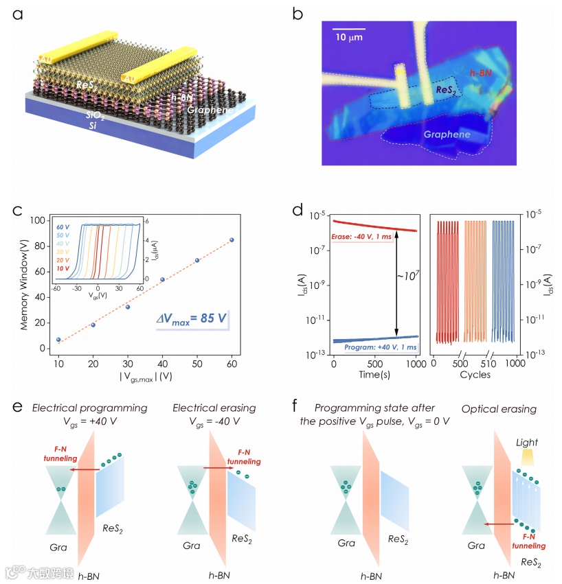 图 1. a)ReS2/ h-BN/ Gra异质结构的示意图;b)该异质结构的光学显微镜图像;c)存储窗口随栅极电压(Ve)最大值(Vgs,max)变化的关系曲线,插图为不同栅极电压(Vgs)扫描范围下的转移特性曲线;d)施加 ±40 V、1 ms 脉冲后,非易失性存储器的保留特性与耐久性曲线;e)电编程与电擦除过程中的能带示意图;f)光擦除过程中的能带示意图。