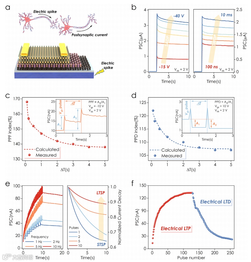 图 2. a)电脉冲驱动的突触晶体管示意图;b)突触后电流(PSC)随电压幅度(-15~-40 V,脉冲宽度 1 ms)变化的曲线(对应脉冲幅度依赖可塑性 SADP),以及突触后电流随脉冲宽度(100 ns~10 ms,电压 - 20 V)变化的曲线(对应脉冲宽度依赖可塑性 SWDP);c)成对脉冲易化(PPF)指数与时间间隔(ΔT)的函数关系,插图为 PPF 测试所用的栅源电压(Vgs)输入脉冲(-10 V,1 ms)及对应的电流响应;d)成对脉冲抑制(PPD)指数与时间间隔(ΔT)的函数关系,插图为 PPD 测试所用的栅极电压(Vg)输入脉冲(10 V,1 ms)及对应的电流响应;e)10 秒内脉冲数量从 10 个增至 100 个时的突触后电流变化(电压 - 10 V,脉冲宽度 1 ms,对应脉冲频率依赖可塑性 SFDP),以及电压脉冲数量从 1 个增至 10 个时的突触后电流变化(电压 - 10 V,脉冲宽度 1 ms,频率 1 Hz,对应脉冲数量依赖可塑性 SNDP);f)通过电编程与电擦除实现电长时增强(LTP)与电长时增强(LTP)的过程,其中编程脉冲参数为 - 4.5 V、10 ms、1 Hz,擦除脉冲参数为 9 V、10 ms、1 Hz。