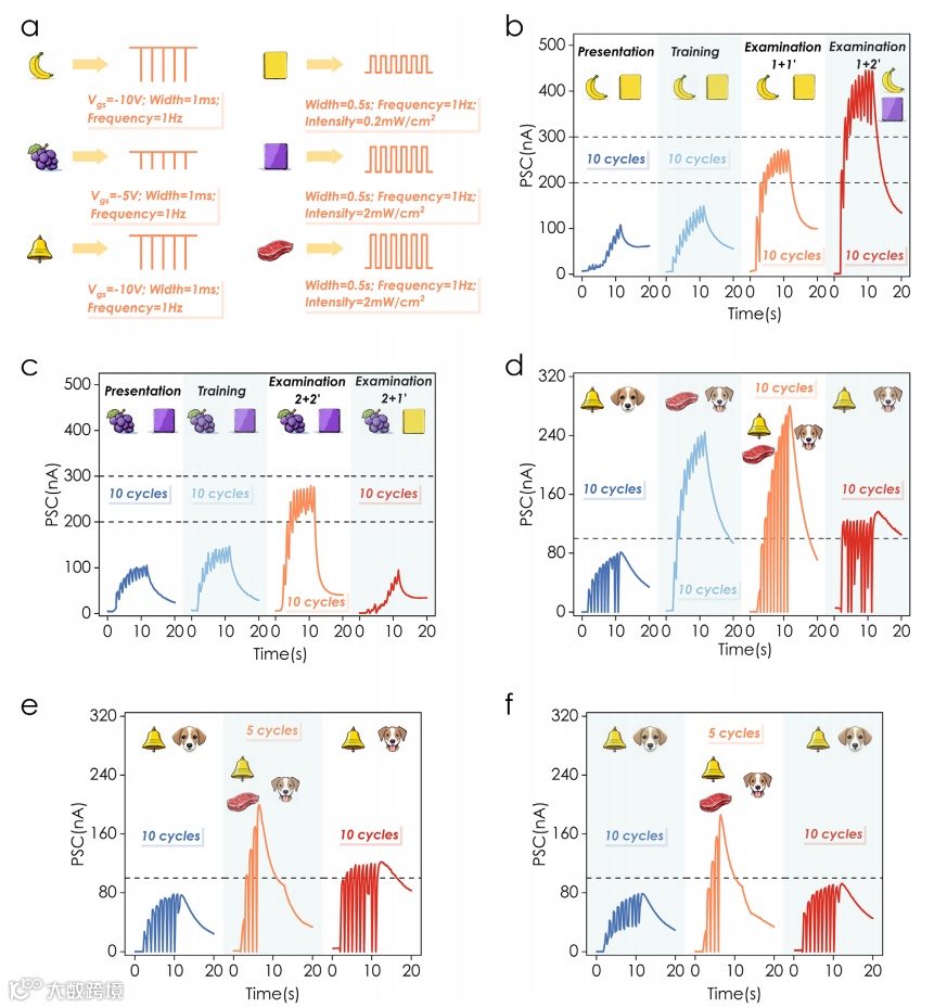 图 4. a)输入栅极电压(Vgs)/ 光脉冲与香蕉、黄色卡片、葡萄、紫色卡片、铃声、食物等刺激信号的对应关系;b)测试阶段香蕉与黄色卡片配对成功,香蕉与紫色卡片配对无有效响应;c)测试阶段葡萄与紫色卡片配对成功,葡萄与黄色卡片配对无有效响应;d)条件反射的建立过程;e)条件反射的消退过程;f)条件反射的完全遗忘过程。