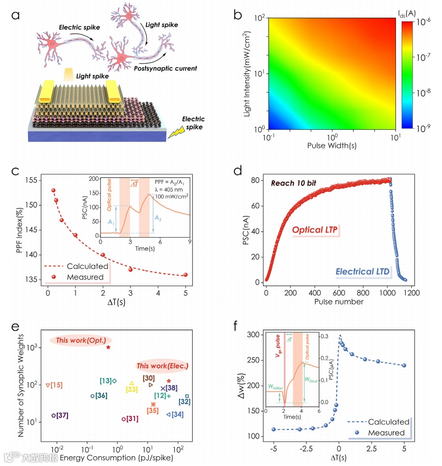 除了电脉冲激发的轴突 - 树突结构外,光脉冲还可直接激活突触后终端的轴突 - 轴突信号通路(图 3a)。图 3b 为 Ids 随光强与脉冲宽度变化的热图,显然,光强更大、宽度更宽的光脉冲会引发更强的电荷隧穿效应,产生更大的兴奋性 PSC。图 3c 显示,施加两个强度(100 mW/cm2)与宽度(1 s)相同的光脉冲,可实现 PPF 行为;PPF 指数从 153% 降至 136%,对应的 τ1=0.17 s、τ2=1.61 s。
