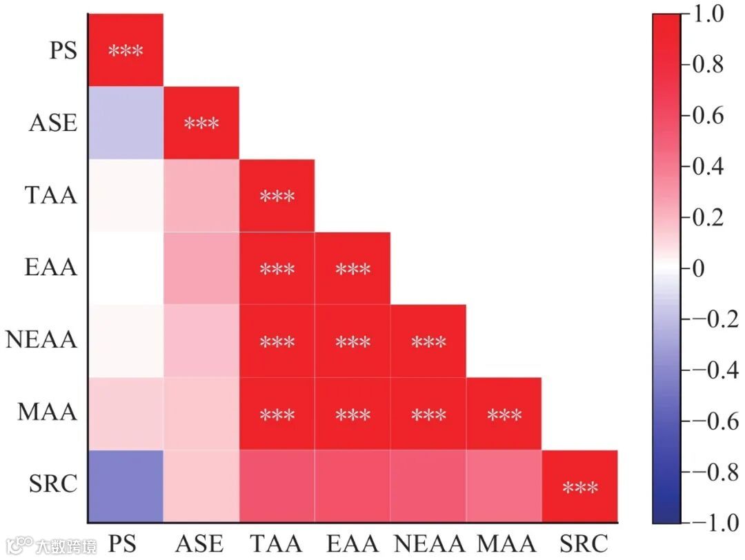 注:*表示显著相关(P<0.05);**表示极显著相关(P<0.01);***表示高度极显著相关(P<0.01);PS:石斛多糖,ASE:醇溶性浸出物,TAA:氨基酸总量,EAA:必需氨基酸;NEAA:非必需氨基酸;MAA:药用氨基酸;SRC:氨基酸比值系数评分。