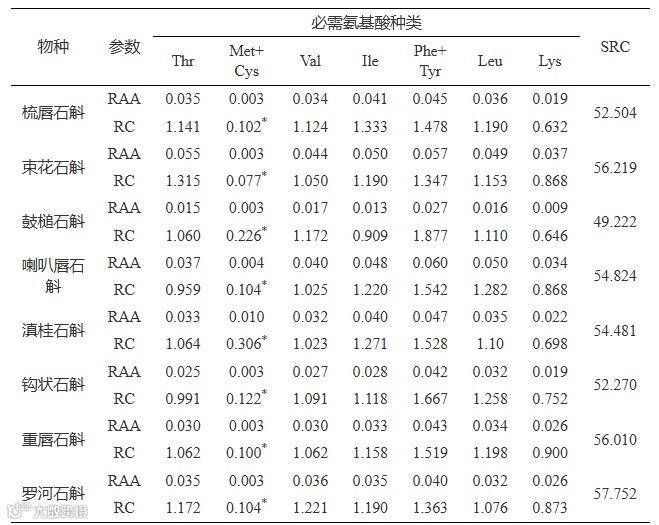 注:“*”为第一限制性氨基酸;RC:必需氨基酸比值系数;RAA:必需氨基酸比值;SRC:必需氨基酸比值系数分。