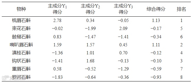 表 9 8种石斛属植物因子得分及综合得分排名