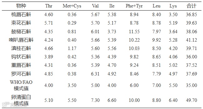 表 6 8种石斛属植物必需氨基酸质量分数与WHO/FAO推荐模式比较(%)